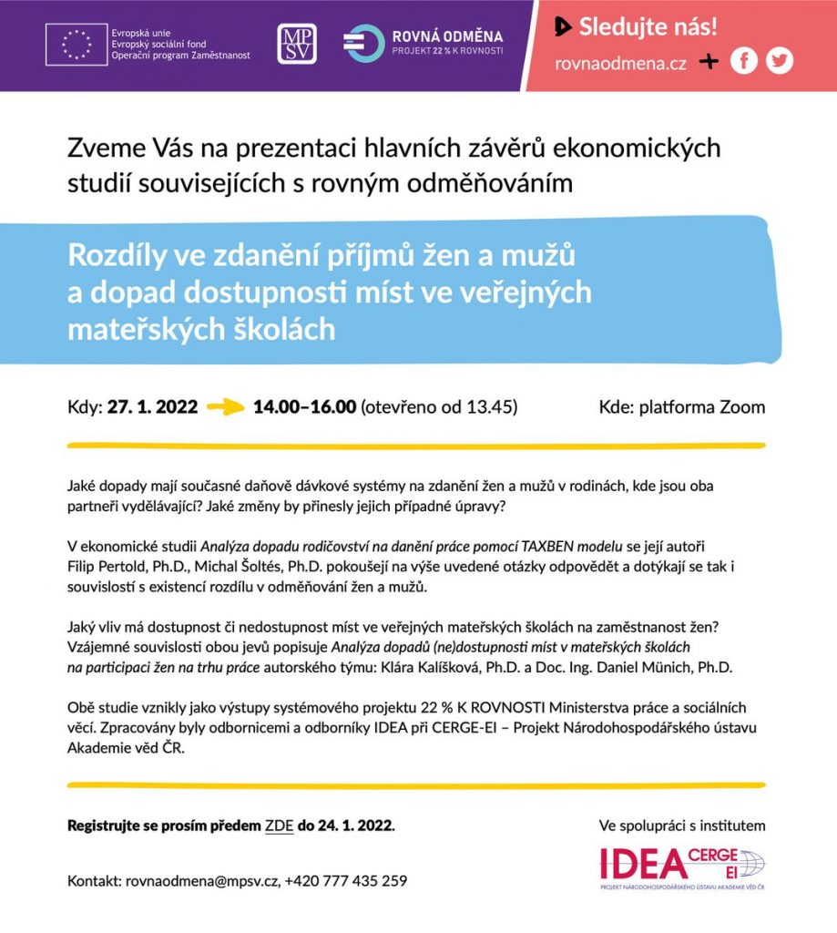 Dne 27. 1. proběhl webinář zabývající se dvěma studiemi expertů z IDEA při Cerge-EI, které zpracovaly výstupy našeho projektu. Tématem byly slabiny současného daňově dávkového systému, který kromě dalšího nemotivuje ženy na rodičovské k dřívějšímu návratu do zaměstnání, a souvislost (ne)dostupnosti mateřských škol a rozdílu v odměňování mužů a žen. Studie jsou k dispozici zde: https://bit.ly/3I4mdXB a zde: https://bit.ly/3564iBb.