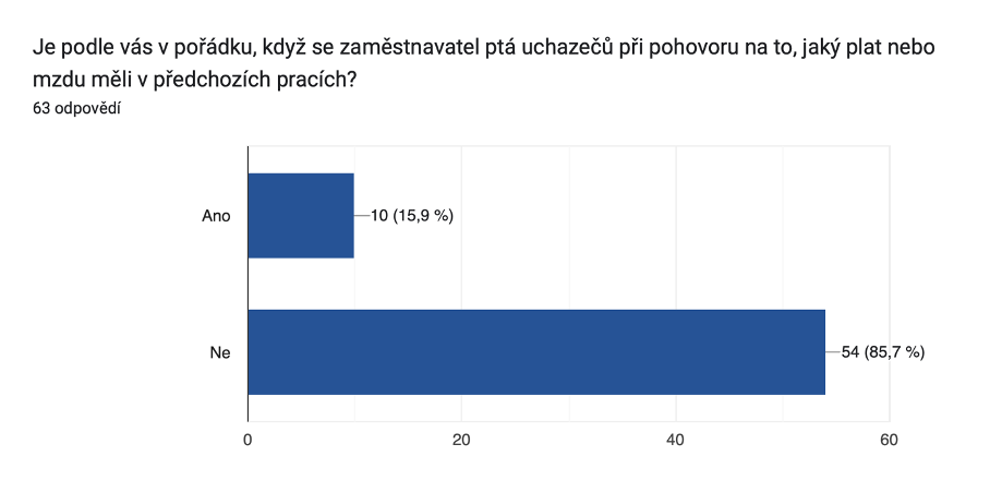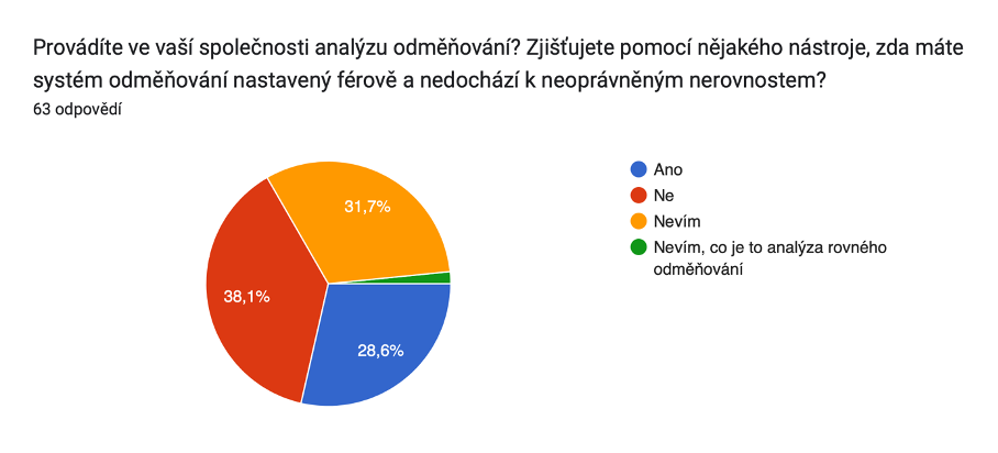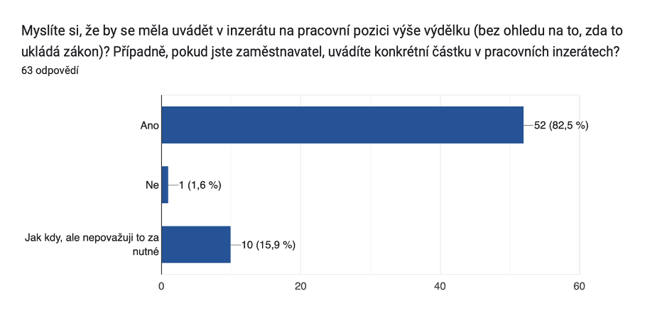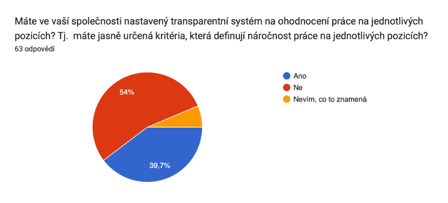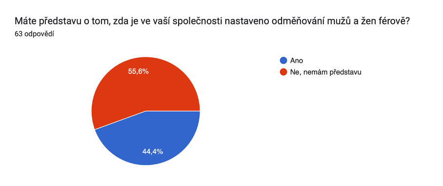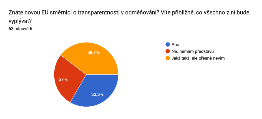 Zajímalo nás, jak mají respondenti a respondentky nastavené odměňování v jejich společnosti, zda se v systému odměňování orientují nebo jak by si představovali transparentnost v rámci náboru. Zeptali jsme se rovněž, zda znají novou EU směrnici o transparentnosti v odměňování. Potěšilo nás, že více než třetina respondentů a respondentek odpověděla kladně. Edukace nejen ohledně směrnice a pomoci firmám s přípravou na její implementaci, ale ohledně celého tématu transparentnosti je jednou z klíčových aktivit projektu.
