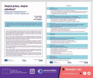 Dne 12. 1. jsme se zúčastnili konference zaměřené na nástroje transparentního odměňování definované ve směrnici Evropského parlamentu a Rady, kterou se posiluje uplatňování zásady stejné odměny mužů a žen za stejnou nebo rovnocennou práci. Konferencí se zahajuje diskuze o směrnici a její