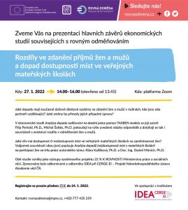 Dne 27. 1. proběhl webinář zabývající se dvěma studiemi expertů z IDEA při Cerge-EI, které zpracovaly výstupy našeho projektu. Tématem byly slabiny současného daňově dávkového systému, který kromě dalšího nemotivuje ženy na rodičovské k dřívějšímu návratu do zaměstnání, a souvislost (ne)dostupnosti mateřských škol a