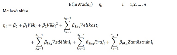 kde ηi je regresní funkce (podmíněná střední hodnota přirozeného logaritmu hrubé měsíční mzdy nebo platu vzhledem k různým kombinacím hodnot vysvětlujících proměnných jako je Věk, Velikost, Vzdělání, Kraj, Zaměstnání), β0 je konstanta , βj je parametr pro j-tou vysvětlující spojitou proměnnou, proměnou (Věk), βjk je parametr, který přísluší k-té kategorii j-té vysvětlující proměnné (j=1,2,…,m,kj=0,1,…,sj−1). U kategoriálních proměnných (Velikost, Vzdělání, Kraj, Zaměstnání) označujeme indexem kj= 0 referenční kategorii. Vysvětlující kategoriální proměnné jsou umělé proměnné, které nabývají pouze hodnot 1 v případě, že i-tý zaměstnanec je zařazen v k-té kategorii j-té vysvětlované proměnné, jinak nabývá hodnoty 0.