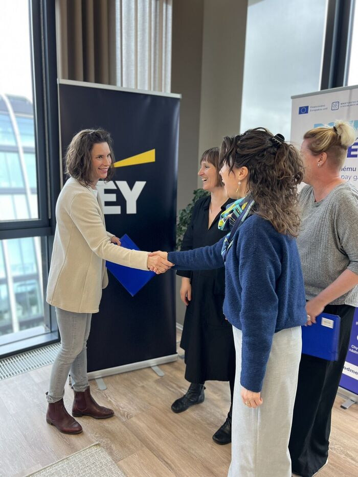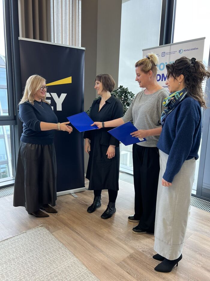 Absolventi školení Dominika Dalekorejová, Kristýna Hercegová, Barbora Smutná a Tomáš Trtek převzali certifikáty o absolvování přímo z rukou Lenky Simerské, garantky projektu Rovná odměna za MPSV. Slavnostního předání se účastnily také lektorky Helena Skálová a Dita Jahodová a Zdeněk Dušek, partner EY odpovědný za projekt.